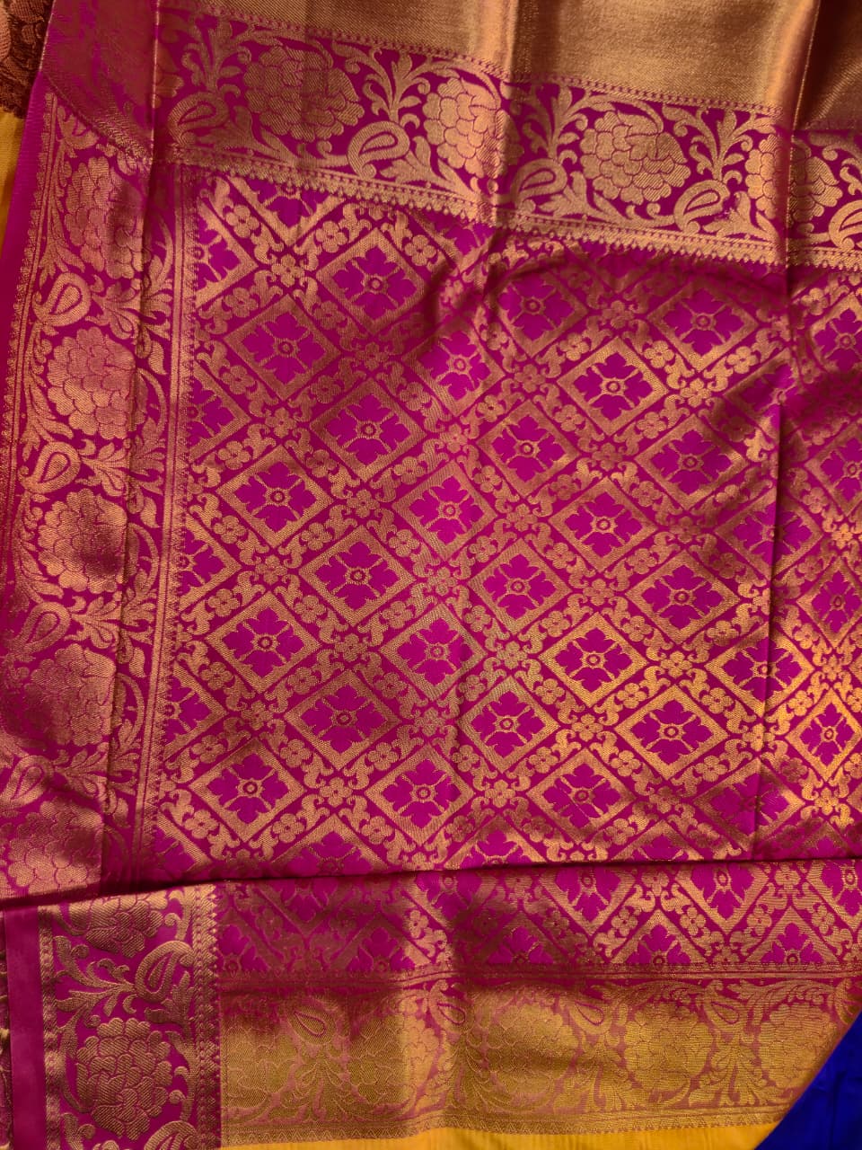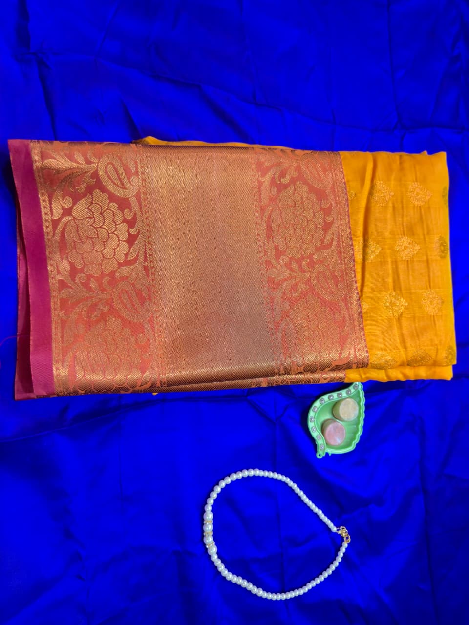 A vibrant Mustard Yellow Art Silk Saree featuring elegant gold zari buttas all over the body and a rich contrast magenta pallu and border with intricate floral zari weaving, comes with a matching blouse piece.
