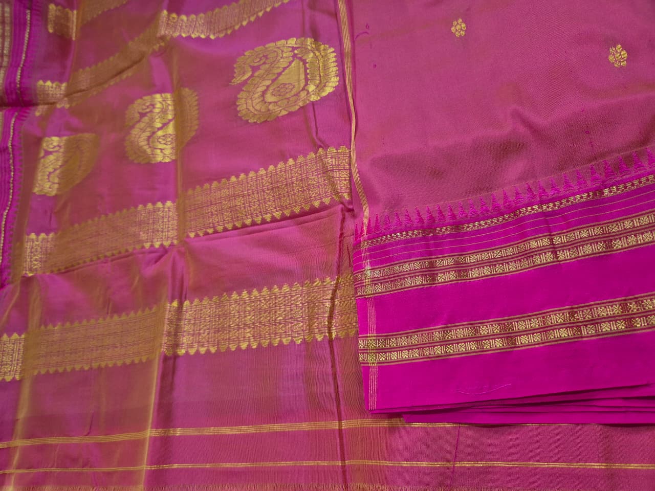 Graceful pink Narayan peth saree featuring subtle gold buttas, paired with an elegant zari-lined border and a rich golden paisley-woven pallu.