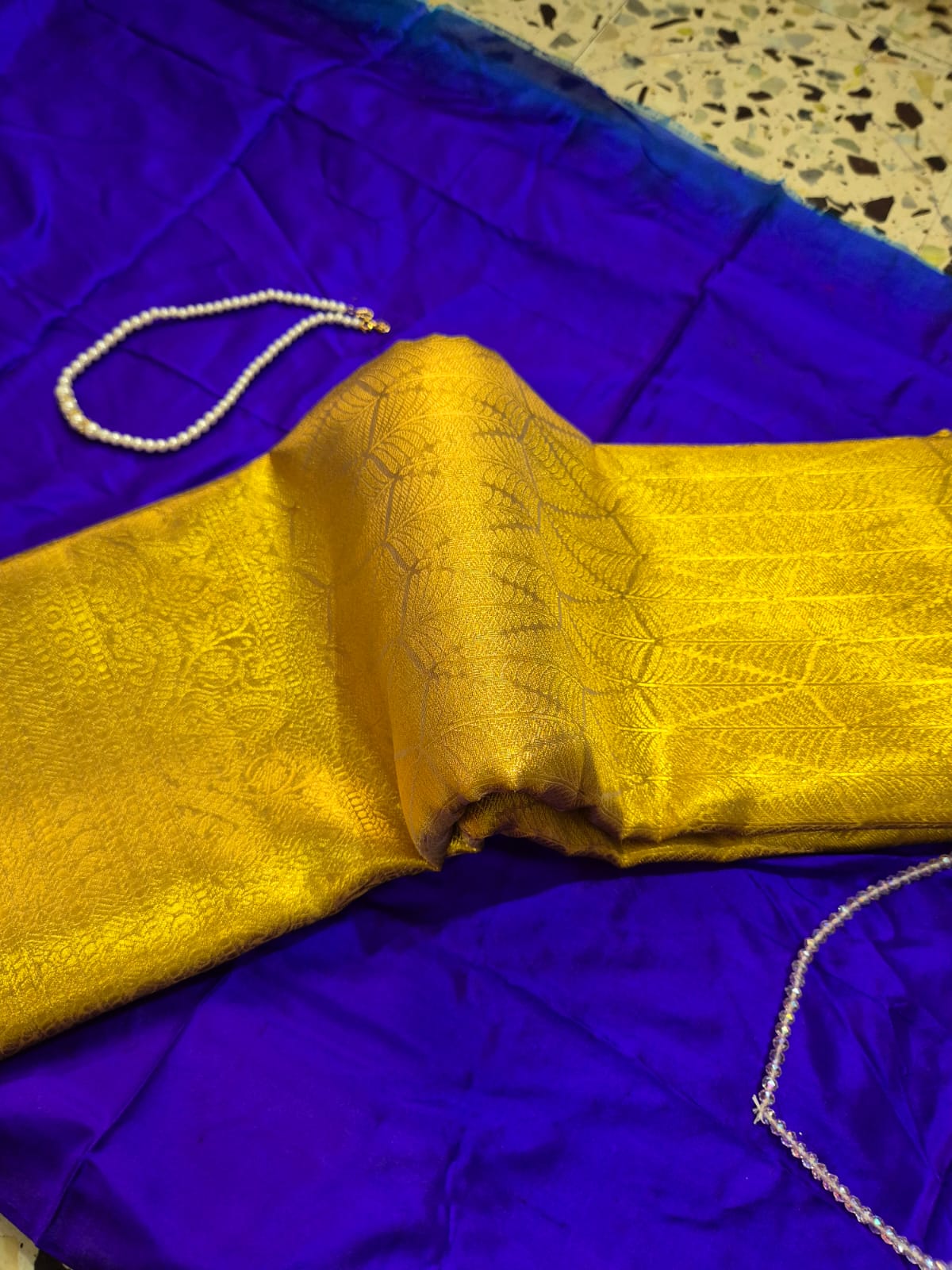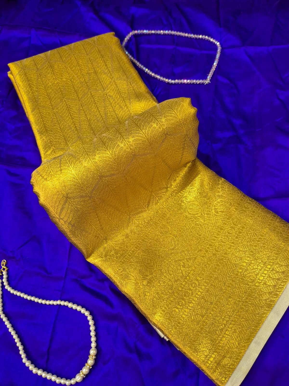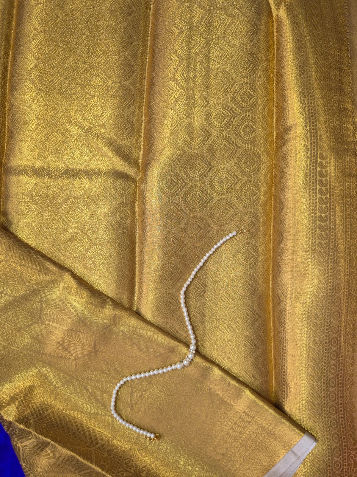 Stunning antique gold Brocade saree richly woven with intricate all-over zari patterns.